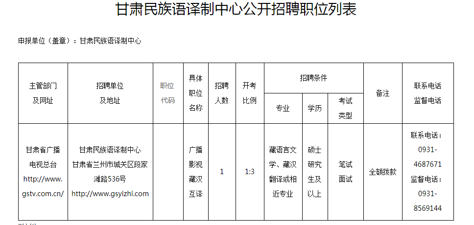 根据《事业单位公开招聘人员暂行规定》(人事部令第6号)《甘肃省事业单位公开招聘人员暂行办法》(甘办发〔2011〕22号)要求和工作需要,我中心现面向社会公开招聘工作人员1人(详见《甘肃民族语译制中心2020年公开招聘职位列表》,以下简称《职位列表》(附件)。现将有关事项公告如下: