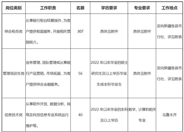 秉承“文化育人、事业留人、制度选人”的理念,新疆农村信用社(农商银行)一直为青年学生的发展成长创造良好环境,为新疆农信系统培养了一大批的管理骨干和业务骨干。为持续推动新疆农村信用社(农商银行)高质量发展,加强员工队伍建设,现面向全国招聘应、历届普通高等院校毕业生具体如下: